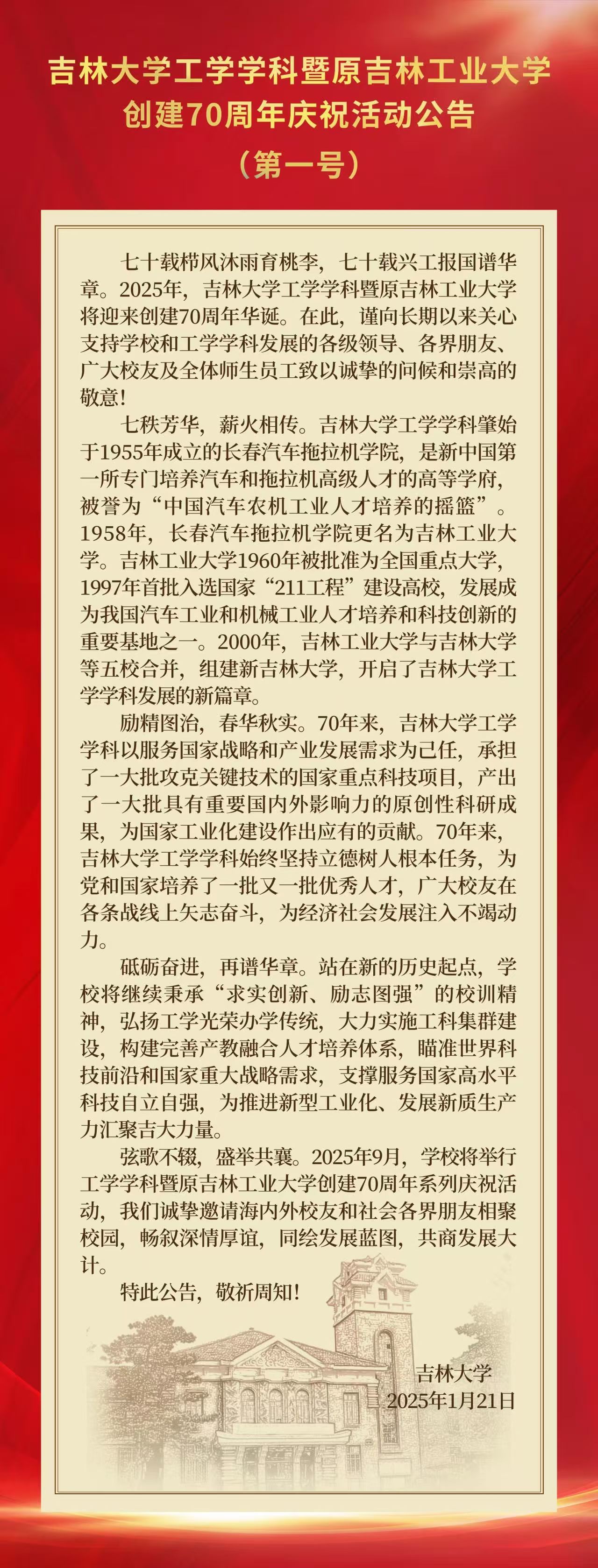 转:吉林大学工学学科暨原吉林工业大学创建70周年庆祝活动公告(第一号)